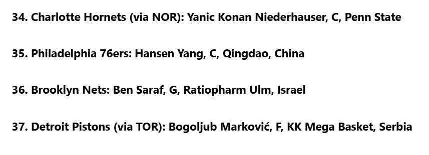 美媒NBC最新一期模拟选秀排名:中国球员杨瀚森第35顺位被76人选中